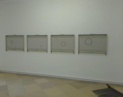 Seit über 20 Jahren hält sie ihr strenges Konzept nun schon durch. Ihre buchhalterisch penibel datierten "Aufzeichnungen von bis". Auf den ersten Blick unspektakuläre Zeichnungen, die immer "nur" aus einer einzigen feinen Linie bestehen, mit unglaublicher Präzision freihändig gezogen, eine eng von außen nach innen verlaufende Spirale wie die Spur, der die Nadel eines Plattenspielers folgt. Doch während in der Rille einer Schallplatte vielleicht Beethovens Neunte Platz hat, enthält so eine Tuschelinie mehrere Tage, im Extremfall ein ganzes Jahr. In der kompletten Ausstellung stecken sogar 882 Tage drin. Plus ein paar "Aufwärmrunden". Das IST also überhaupt keine abstrakte Kunst, das ist ein ziemlich realistisches Abbild der . . . Zeit. Und wie ein gewisser Richard Flynman einmal gesagt hat (wobei ich ja glaube, dass das ein Druckfehler ist und der Spruch in dieser Sammlung von Zitaten in Wahrheit vom Physiknobelpreisträger Richard Feynman stammt): "Zeit ist das, was passiert, wenn SONST nichts passiert."