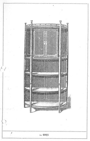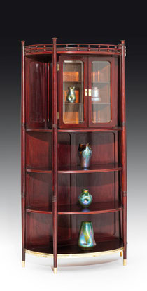 Josef Hoffmann hat 1900 diesen Schrank für die VIII. Ausstellung der Wiener Secession entworfen. Das Möbel wird in der Zeitschrift "Dekorative Kunst" mit "Josef Hoffmann, brauner Salonkasten aus Zeregottiholz, Einlagen: Cedernpyramiden, Füllungen: Synaigunde, ausgeführt von Portois & Fix" betitelt.