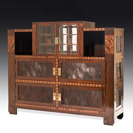 Zeregottiholz, massiv und auf Nadelholz furniert, stilisierte florale und geometrische Intarsien in Zedernpyramidenholz, Füllungen: Synaigunde, xylektypomartig behandelt (auf Fasernwirkung geätzt), Oberfläche gereinigt und zart überarbeitet, Messingbeschläge, 12 Stück facettierte und geschliffene, rechteckige Kristallglasscheiben, originaler Erhaltungszustand, H 157 cm, B 201 cm, T 44 cm