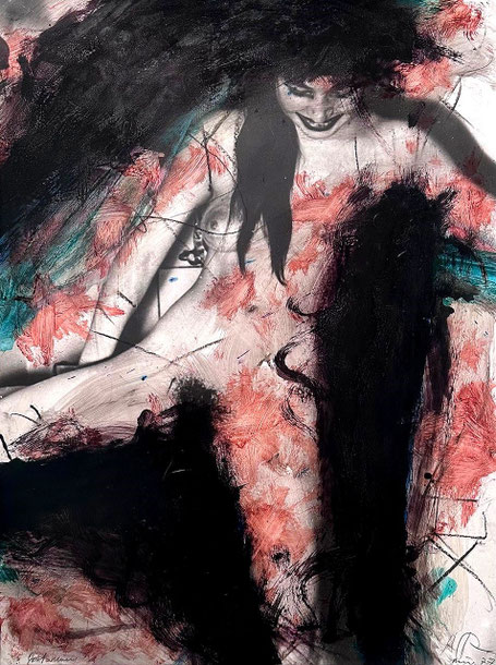 seinen Überarbeitungen reagiert er auf die Körperformen der Frauen. Das Eindeutige wird von ihm verhüllt und mit grafischen Kommentaren versehen, die sich harmonisch in die Aktkomposition