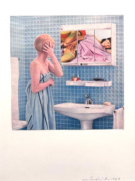 In der gezeigten Collage sieht die Frau anstelle ihres Spiegelbildes eine Koitusszene. Dies lässt sich als eine Darstellung ihres Denkprozesses oder ihrer Vorstellungskraft interpretieren, wobei das Geschehen im Spiegel den aktuellen Bewusstseinsinhalt der Frau widerspiegelt. Obwohl Gerhard Rühm nicht unmittelbar als ein Vertreter der 68er-Bewegung und der sexuellen Revolution in Verbindung gebracht werden kann, spiegeln seine Werke den Geist dieser Zeit wider und reflektieren einige ihrer zentralen Themen. Die 68er-Bewegung war geprägt von einem Aufbegehren gegen Autorität, gesellschaftliche Normen und konventionelle Moralvorstellungen. Sie setzte sich für individuelle Freiheit, Selbstbestimmung und Gleichberechtigung ein, was auch eine Offenheit für neue künstlerische Ausdrucksformen mit sich brachte. In diesem Kontext fanden experimentelle Künstler wie Gerhard Rühm, die die Grenzen der Kunst und der Gesellschaft herausforderten, ein fruchtbares Umfeld für ihre Arbeit.
